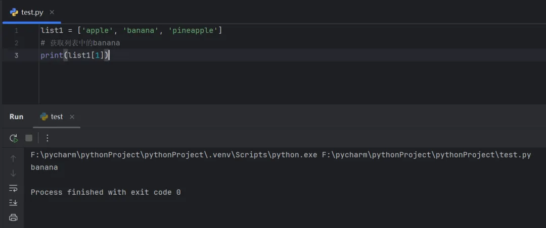 list1 = ['apple', 'banana', 'pineapple']# 获取列表中的bananaprint(list1[1])