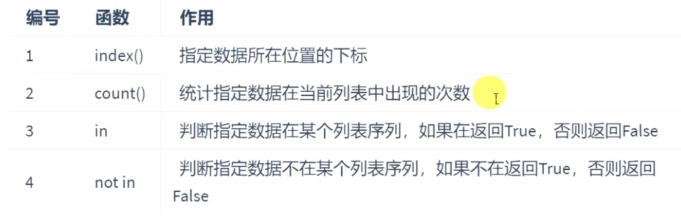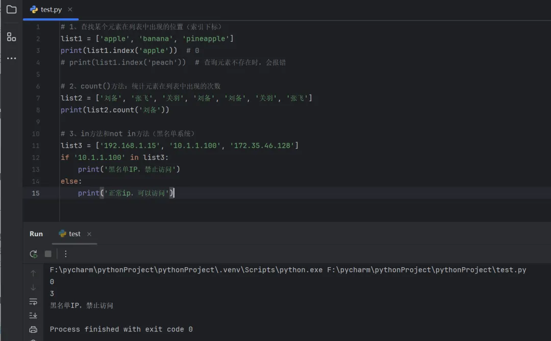 # 1、查找某个元素在列表中出现的位置(索引下标)list1 = ['apple', 'banana', 'pineapple']print(list1.index('apple')) # 0# print(list1.index('peach')) # 查询元素不存在时,会报错# 2、count()方法:统计元素在列表中出现的次数list2 = ['刘备', '张飞', '关羽', '刘备', '刘备', '关羽', '张飞']print(list2.count('刘备')) # 3# 3、in方法和not in方法(黑名单系统)list3 = ['192.168.1.15', '10.1.1.100', '172.35.46.128']if'10.1.1.100' in list3: print('黑名单IP,禁止访问')else: print('正常ip,可以访问')