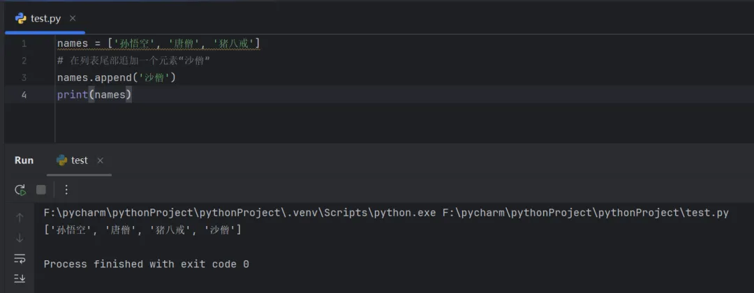 names = ['孙悟空', '唐僧', '猪八戒']# 在列表尾部追加一个元素“沙僧”names.append('沙僧')print(names)