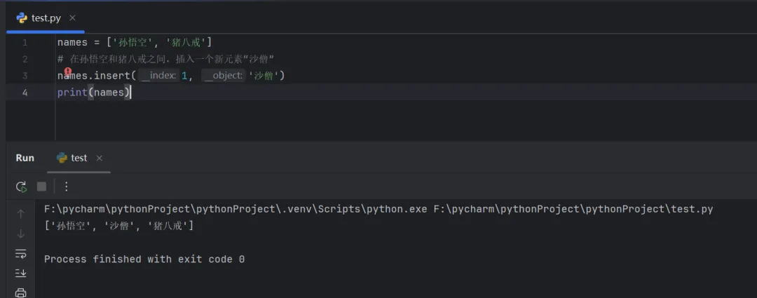 names = ['孙悟空', '猪八戒']# 在孙悟空和猪八戒之间,插入一个新元素“沙僧”names.insert(1, '沙僧')print(names)