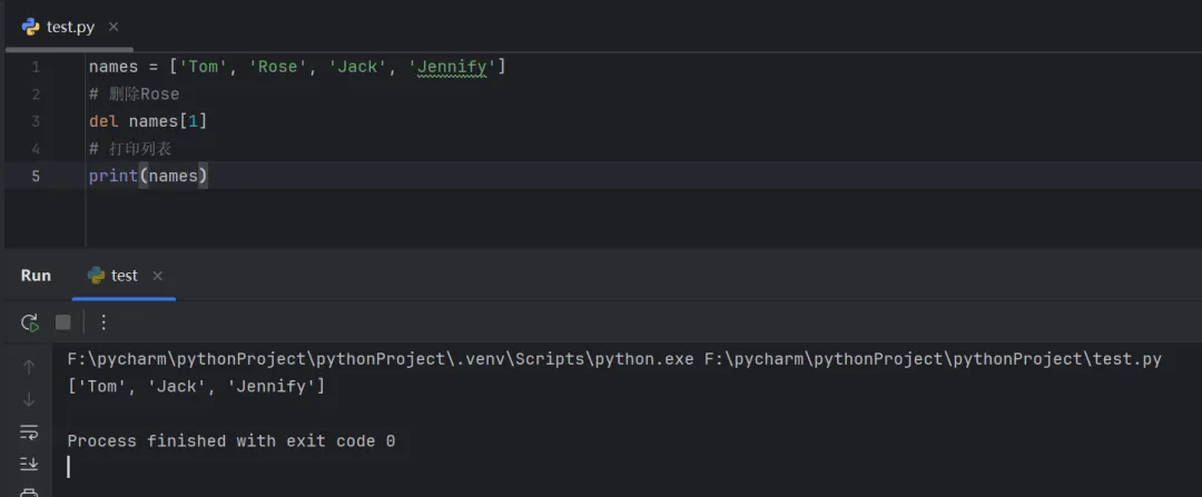 names = ['Tom', 'Rose', 'Jack', 'Jennify']# 删除Rosedel names[1]# 打印列表print(names)