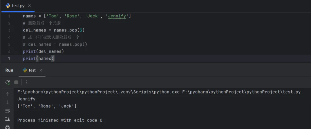 names = ['Tom', 'Rose', 'Jack', 'Jennify']# 删除最后一个元素del_names = names.pop(3)# 或 不下标默认删除最后一个# del_names = names.pop()print(del_names)print(names)