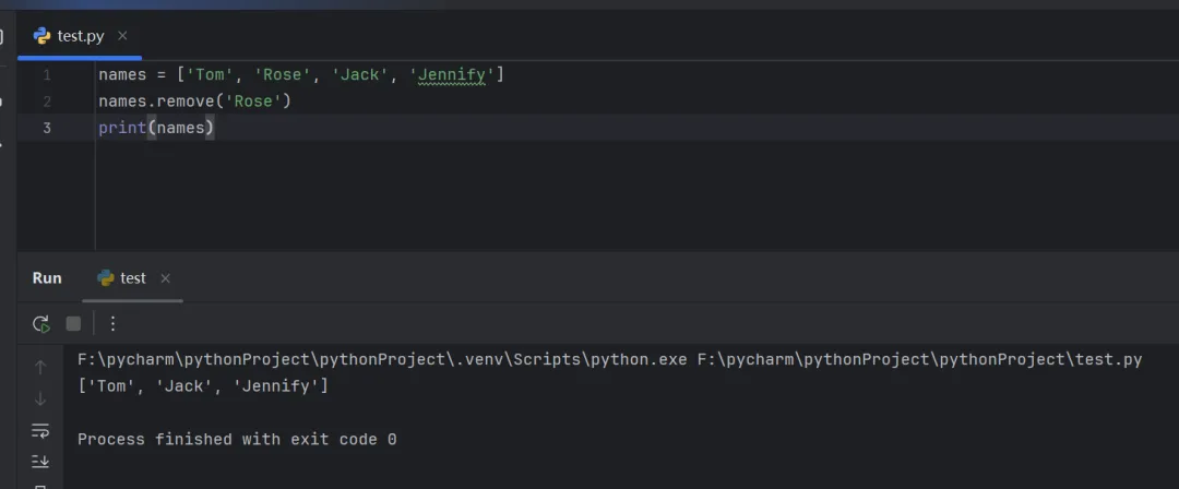 names = ['Tom', 'Rose', 'Jack', 'Jennify']names.remove('Rose')print(names)