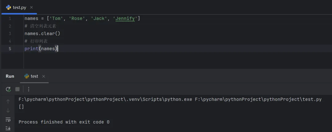 names = ['Tom', 'Rose', 'Jack', 'Jennify']# 清空列表元素names.clear()# 打印列表print(names)