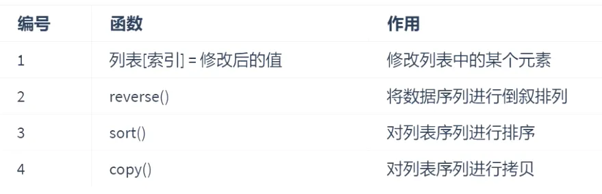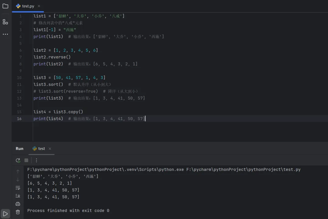 list1 = ['貂蝉', '大乔', '小乔', '八戒']# 修改列表中的“八戒”元素list1[-1] = "西施"print(list1) # 输出结果:['貂蝉', '大乔', '小乔', '西施']list2 = [1, 2, 3, 4, 5, 6]list2.reverse()print(list2) # 输出结果:[6, 5, 4, 3, 2, 1]list3 = [50, 41, 57, 1, 4, 3]list3.sort() # 默认升序(从小到大)# list3.sort(reverse=True) # 降序(从大到小)print(list3) # 输出结果:[1, 3, 4, 41, 50, 57]list4 = list3.copy()print(list4) # 输出结果:[1, 3, 4, 41, 50, 57]