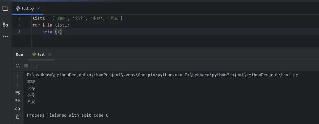 list1 = ['貂蝉', '大乔', '小乔', '八戒']for i in list1: print(i)