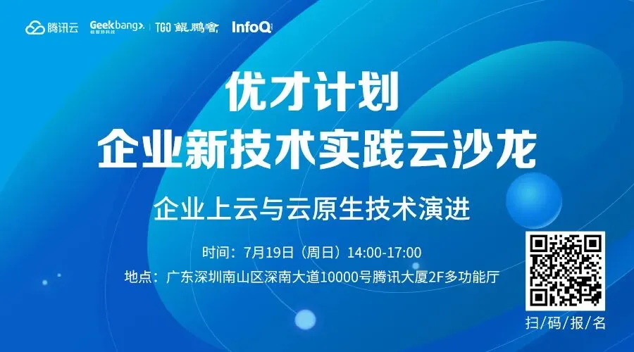 7 月 19 日下午 2 点,「优才计划·企业新技术实践云沙龙—企业上云与云原生技术演进」将在深圳腾讯大厦举办,为大家分享企业上云实践、云原生技术的应用,为云计算人才输送技术干货。新基建背景下,技术人才如何拥抱新技术?企业数字化转型需要什么样的新型人才?