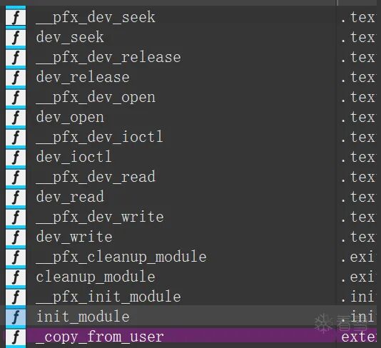 接着 ida 逆向分析babydev.ko模块,查看函数表的函数,其中__pfx_开头的是内核在符号层面生成的前缀符号。