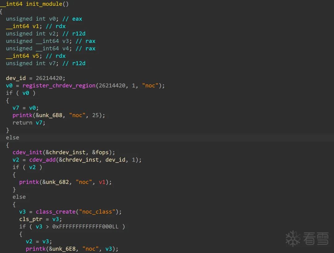 init_module函数init_module函数初始化了一个名为noc的字符设备,创建了/dev/noc供用户态交互,并分配了一个约 64KB 的全局内核堆缓冲区global_buf。