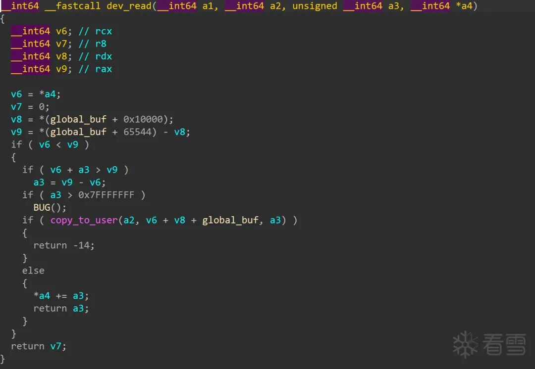 当v4 + a3 > 0x10000时,驱动试图通过v6 = -*a4截断写入长度,但由于v6为无符号整型,该赋值触发了 signed 到 unsigned 的隐式转换,导致v6变成一个极大的正数。
