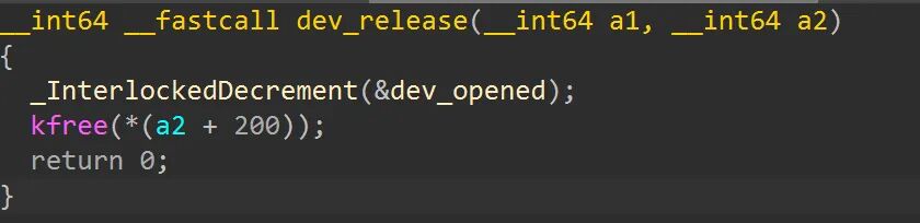 dev_release函数在关闭设备文件时原子递减打开计数并释放filp->private_data。