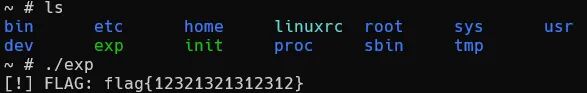 #!/bin/shqemu-system-x86_64 \ -m 128M \ -kernel ./bzImage \ -initrd ./exp.cpio \ -monitor /dev/null \ -append "root=/dev/ram rdinit=/init console=ttyS0 oops=panic panic=1 quiet rodata=off " \ -cpu qemu64,+smep,+smap \ -smp cores=2,threads=1 \ -nographic \ -snapshot执行exp然后成功拿到 flag: