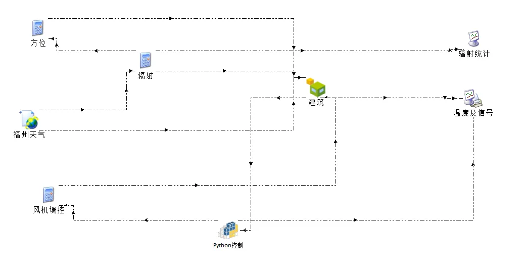所用模块:Type15(天气文件)、Type56(建筑模块)、Type3157(Python数据接口)、Type65c(数据输出)、equation(计算器)。