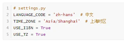 同样在settings.py中,找到「LANGUAGE_CODE」和「TIME_ZONE」,修改为:
