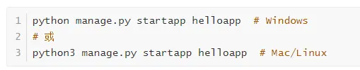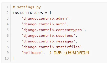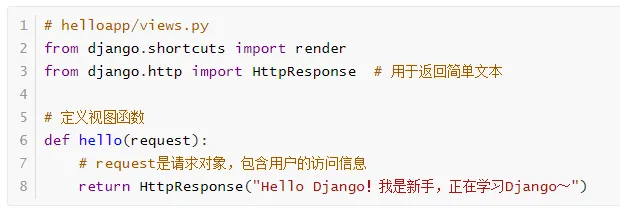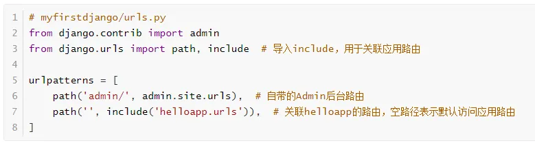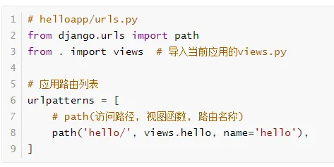 第一步:配置应用路由(helloapp/urls.py),先创建这个文件(helloapp文件夹里默认没有,手动新建),编写如下代码: