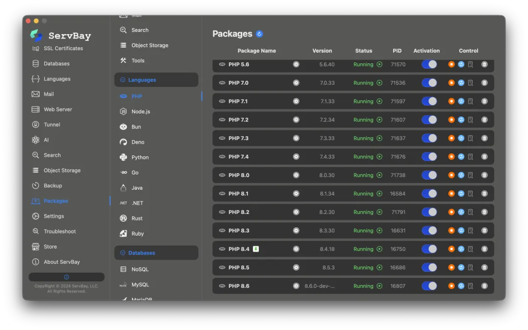用 ServBay 就能够一键部署完整的 PHP 环境,并且多个 PHP 版本同时运行。这让开发者可以在不干扰现有项目的前提下,快速上线最新的环境来实践这些现代化的架构思维。