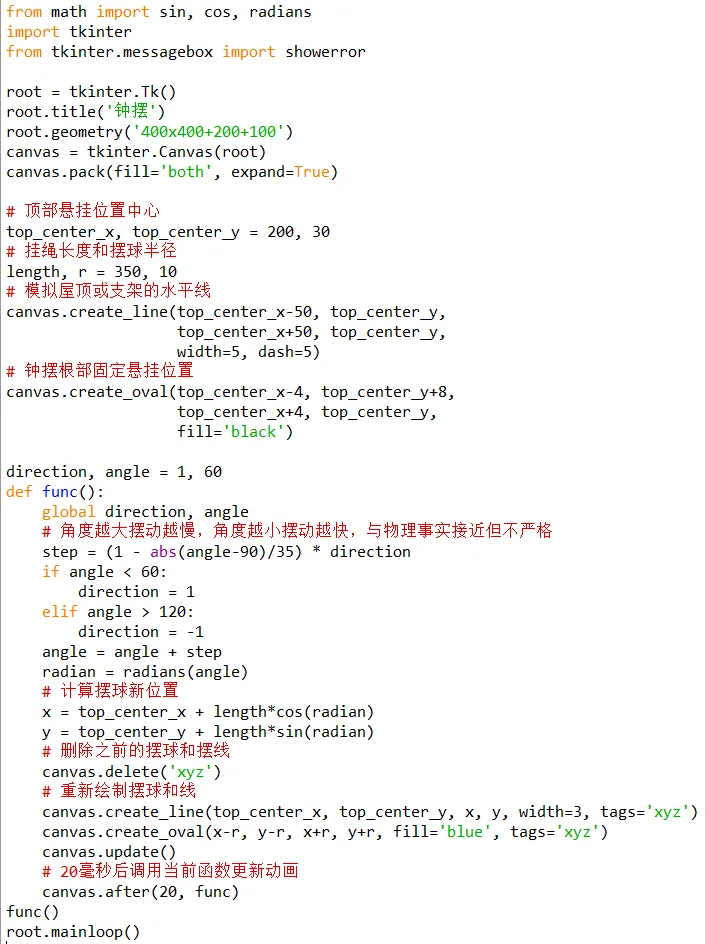 编写Python程序,使用tkinter设计界面,使用Canvas对象的方法绘制直线和椭圆,模拟钟摆运动。摆球位置越高速度越慢,位置越低速度越快。