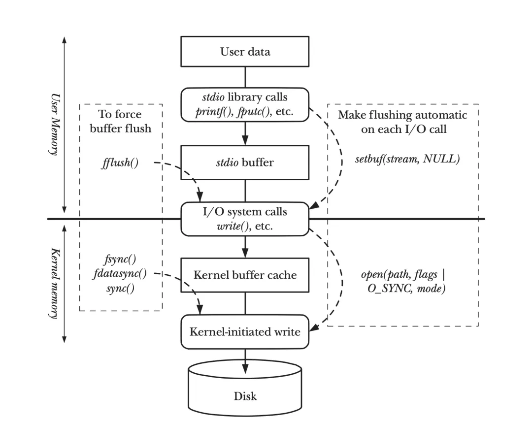 从结构上来看, 会有stdio缓冲和内核缓冲, 使用setbuf()可以设置缓冲的模式, 而fflush()可以把stdio缓冲的数据强制写入到内核, 否则只能等待stdio缓冲的数据达到一定大小之后会自动写入, 但是这不代表数据会马上写入到文件. 如果希望写入的数据能马上从内核缓冲写入到文件, 则可以使用open()函数设置O_SYNC属性, 或者在调用write()之后调用sync()相关函数来强制数据写入到文件中.