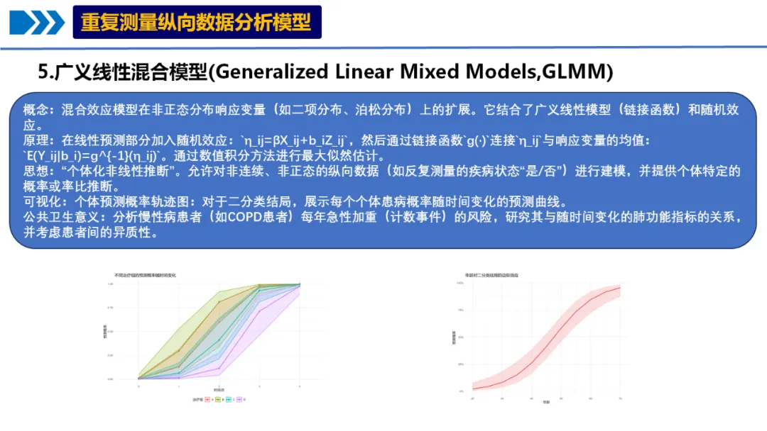 思想:“个体化非线性推断”。允许对非连续、非正态的纵向数据(如反复测量的疾病状态“是/否”)进行建模,并提供个体特定的概率或率比推断。