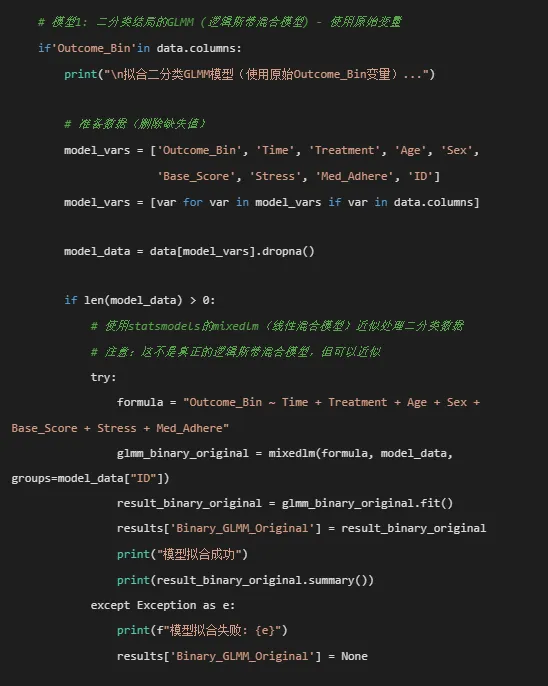 # ============================================# 广义线性混合模型 (GLMM) 分析 - Python实现版# ============================================import osimport sysimport warningsimport numpy as npimport pandas as pdimport matplotlib.pyplot as pltimport seaborn as snsfrom pathlib import Pathimport statsmodels.api as smfrom statsmodels.formula.api import mixedlm, gee, poisson, negativebinomialimport statsmodels.formula.api as smffrom statsmodels.genmod.families import Binomial, Poisson, NegativeBinomialfrom statsmodels.genmod.generalized_linear_model import GLMfrom statsmodels.tools.tools import add_constantfrom sklearn.preprocessing import LabelEncoder, StandardScalerfrom scipy import statsimport pingouin as pgimport jsonfrom datetime import datetimeimport matplotlibmatplotlib.use('Agg') # 使用非交互式后端warnings.filterwarnings('ignore')# ============================================# 0. 环境设置与包安装# ============================================print("=" * 60)print("广义线性混合模型 (GLMM) 分析 - Python实现")print("=" * 60)# 尝试导入所需包,如果失败则安装required_packages = ['pandas', 'numpy', 'scipy', 'statsmodels','matplotlib', 'seaborn', 'pingouin', 'openpyxl']import subprocessimport importlibfor package in required_packages: try: importlib.import_module(package) except ImportError:print(f"正在安装 {package}...") subprocess.check_call([sys.executable, "-m", "pip", "install", package])# 重新导入import pandas as pdimport numpy as npimport statsmodels.api as smimport matplotlib.pyplot as pltimport seaborn as snsimport pingouin as pg# 设置中文字体(如果系统支持)try: plt.rcParams['font.sans-serif'] = ['SimHei', 'Arial Unicode MS', 'DejaVu Sans'] plt.rcParams['axes.unicode_minus'] = Falseexcept: pass# ============================================# 1. 路径设置与文件夹创建# ============================================# 自动查找桌面路径if os.name == 'nt': # Windows desktop_path = os.path.join(os.path.join(os.environ['USERPROFILE']), 'Desktop')else: # Mac/Linux desktop_path = os.path.join(os.path.join(os.path.expanduser('~')), 'Desktop')# 设置工作路径work_dir = os.path.join(desktop_path, '5-GLMM结果')if not os.path.exists(work_dir): os.makedirs(work_dir)print(f"创建结果文件夹: {work_dir}")# 数据文件路径data_file = os.path.join(desktop_path, 'longitudinal_data.xlsx')if not os.path.exists(data_file):print(f"警告: 数据文件未找到: {data_file}")print("请确保 'longitudinal_data.xlsx' 文件在桌面上")# 创建示例数据用于测试print("创建示例数据用于演示...") create_sample_data = Trueelse: create_sample_data = False# ============================================# 2. 数据读取与预处理# ============================================def load_and_preprocess_data():"""加载和预处理数据"""print("\n1. 数据读取与预处理")print("-" * 40)if create_sample_data:# 创建示例数据 np.random.seed(123) n_subjects = 100 n_timepoints = 5 n_total = n_subjects * n_timepoints data = pd.DataFrame({'ID': np.repeat(range(1, n_subjects + 1), n_timepoints),'Time': np.tile(range(1, n_timepoints + 1), n_subjects),'Outcome_Continuous': np.random.normal(50, 10, n_total),'Outcome_Binary': np.random.binomial(1, 0.8, n_total),'Outcome_Count': np.random.poisson(5, n_total),'Stress_Level': np.random.normal(50, 15, n_total),'Quality_of_Life': np.random.normal(70, 10, n_total),'Medication_Adherence': np.random.normal(80, 10, n_total),'Baseline_Score': np.random.normal(60, 12, n_total),'School_ID': np.random.choice(['A', 'B', 'C'], n_total),'Genetic_Marker': np.random.choice([0, 1], n_total),'SES': np.random.choice(['Low', 'Medium', 'High'], n_total),'Latent_Class': np.random.choice([1, 2, 3], n_total),'Sex': np.random.choice(['M', 'F'], n_total),'Treatment': np.random.choice(['Control', 'Treatment'], n_total),'Age': np.random.normal(45, 10, n_total),'Variable2': np.random.normal(30, 5, n_total),'Survival_Time': np.random.exponential(100, n_total),'Event_Status': np.random.choice([0, 1], n_total, p=[0.7, 0.3]) })# 添加一些缺失值for col in ['Outcome_Continuous', 'Stress_Level', 'Quality_of_Life']: idx = np.random.choice(n_total, size=int(n_total * 0.05), replace=False) data.loc[idx, col] = np.nanprint("使用示例数据 (模拟数据)")else:# 读取真实数据 try: data = pd.read_excel(data_file, sheet_name='Full_Dataset')print(f"成功读取数据: {data_file}") except Exception as e:print(f"读取数据失败: {e}")print("创建示例数据用于演示...")return load_and_preprocess_data() # 递归调用创建示例数据# 查看数据结构print(f"数据形状: {data.shape}")print(f"变量名: {list(data.columns)}")print("\n数据前5行:")print(data.head())# 检查二分类结局的分布if'Outcome_Binary'in data.columns: binary_dist = data['Outcome_Binary'].value_counts(dropna=False)print(f"\n二分类结局分布:\n{binary_dist}")if binary_dist.get(0, 0) < 20 or binary_dist.get(1, 0) < 20:print("注意: Outcome_Binary 变量变异较少,但可以尝试分析。")# 检查计数结局的分布if'Outcome_Count'in data.columns: count_stats = data['Outcome_Count'].describe()print(f"\n计数结局描述统计:\n{count_stats}") variance = data['Outcome_Count'].var() mean = data['Outcome_Count'].mean()if variance / mean > 1.5:print(f"注意: Outcome_Count 变量过度离散,方差/均值 = {variance / mean:.2f}")# 变量重命名(简化) rename_dict = {'ID': 'ID','Time': 'Time','Outcome_Continuous': 'Outcome_Cont','Outcome_Binary': 'Outcome_Bin','Outcome_Count': 'Outcome_Count','Stress_Level': 'Stress','Quality_of_Life': 'QoL','Medication_Adherence': 'Med_Adhere','Baseline_Score': 'Base_Score','School_ID': 'School','Genetic_Marker': 'Genetic','SES': 'SES','Latent_Class': 'Latent','Sex': 'Sex','Treatment': 'Treatment','Age': 'Age','Variable2': 'Variable2','Survival_Time': 'Survival_Time','Event_Status': 'Event_Status' }# 只重命名存在的列 rename_dict = {k: v for k, v in 