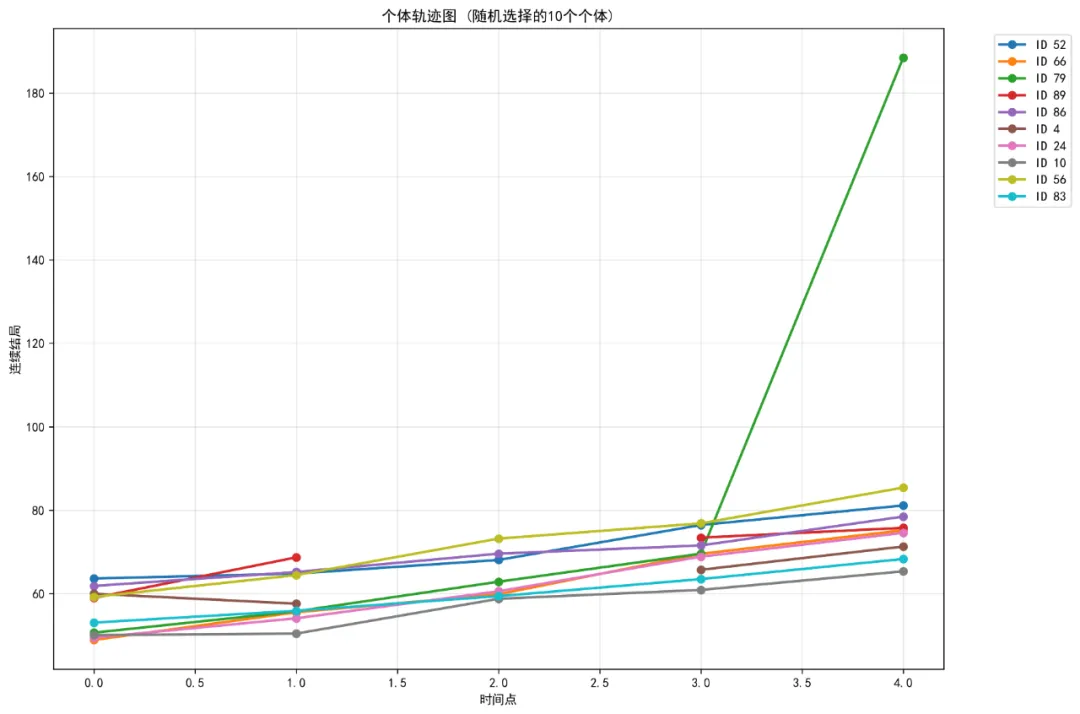 可视化:个体预测概率轨迹图:对于二分类结局,展示每个个体患病概率随时间变化的预测曲线。
