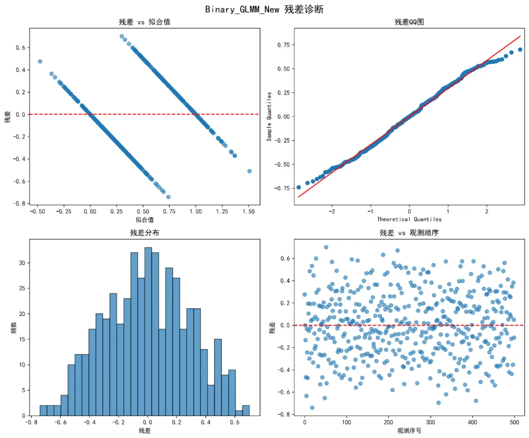 # 模型2: 二分类结局的GLMM - 使用新创建的变量if'High_Count'in data.columns:print("\n拟合二分类GLMM模型(使用新创建的High_Count变量)...") model_vars = ['High_Count', 'Time', 'Treatment', 'Age', 'Sex','Base_Score', 'Stress', 'Med_Adhere', 'ID'] model_vars = [var for var in model_vars if var in data.columns] model_data = data[model_vars].dropna()if len(model_data) > 0: try:# 将High_Count转换为数值型 model_data['High_Count_num'] = model_data['High_Count'].astype(int) formula = "High_Count_num ~ Time + Treatment + Age + Sex + Base_Score + Stress + Med_Adhere" glmm_binary_new = mixedlm(formula, model_data, groups=model_data["ID"]) result_binary_new = glmm_binary_new.fit() results['Binary_GLMM_New'] = result_binary_newprint("模型拟合成功")print(result_binary_new.summary()) except Exception as e:print(f"模型拟合失败: {e}") results['Binary_GLMM_New'] = None# 模型3: 计数结局的GLMM - 使用负二项回归(近似混合模型)if'Outcome_Count'in data.columns:print("\n拟合计数GLMM模型(负二项分布)...")# 检查过度离散 var_count = data['Outcome_Count'].var() mean_count = data['Outcome_Count'].mean() dispersion = var_count / mean_countprint(f"过度离散检验: 方差/均值 = {dispersion:.3f}")if dispersion > 1.5:print("使用负二项回归(处理过度离散)") family = 'Negative Binomial'else:print("使用泊松回归") family = 'Poisson' model_vars = ['Outcome_Count', 'Time', 'Treatment', 'Age', 'Sex','Base_Score', 'Stress', 'Med_Adhere', 'ID'] model_vars = [var for var in model_vars if var in data.columns] model_data = data[model_vars].dropna()if len(model_data) > 0: try:# 使用GEE(广义估计方程)近似混合模型 formula = "Outcome_Count ~ Time + Treatment + Age + Sex + Base_Score + Stress + Med_Adhere"if family == 'Negative Binomial':# 负二项回归 model = smf.glm(formula, data=model_data, family=sm.families.NegativeBinomial()).fit()else:# 泊松回归 model = smf.glm(formula, data=model_data, family=sm.families.Poisson()).fit() results['Count_GLMM'] = modelprint(f"{family}模型拟合成功")print(model.summary()) except Exception as e:print(f"模型拟合失败: {e}") results['Count_GLMM'] = None# 模型4: 连续结局的LMM (线性混合模型)if'Outcome_Cont'in data.columns:print("\n拟合连续结局LMM模型...") model_vars = ['Outcome_Cont', 'Time', 'Treatment', 'Age', 'Sex','Base_Score', 'Stress', 'Med_Adhere', 'ID'] model_vars = [var for var in model_vars if var in data.columns] model_data = data[model_vars].dropna()if len(model_data) > 0: try: formula = "Outcome_Cont ~ Time + Treatment + Age + Sex + Base_Score + Stress + Med_Adhere" lmm_cont = mixedlm(formula, model_data, groups=model_data["ID"]) result_lmm_cont = lmm_cont.fit() results['Continuous_LMM'] = result_lmm_contprint("线性混合模型拟合成功")print(result_lmm_cont.summary()) except Exception as e:print(f"模型拟合失败: {e}") results['Continuous_LMM'] = None# 保存模型结果for model_name, model_result in results.items():if model_result is not None:# 保存摘要到文本文件 summary_path = os.path.join(work_dir, f'{model_name}_summary.txt') with open(summary_path, 'w') as f: f.write(str(model_result.summary()))return results, data# ============================================# 5. 模型诊断与评估# ============================================def model_diagnostics(results, data):"""模型诊断与评估"""print("\n4. 模型诊断与评估")print("-" * 40) model_fit_stats = pd.DataFrame()for model_name, model_result in results.items():if model_result is not None:# 提取模型拟合信息 stats_dict = {'Model': model_name,'AIC': getattr(model_result, 'aic', np.nan),'BIC': getattr(model_result, 'bic', np.nan),'LogLik': getattr(model_result, 'llf', np.nan),'Deviance': getattr(model_result, 'deviance', np.nan), }# 尝试获取R²(仅适用于线性模型)if hasattr(model_result, 'rsquared'): stats_dict['R2_marginal'] = model_result.rsquared stats_dict['R2_conditional'] = np.nan # 条件R²需要额外计算else: stats_dict['R2_marginal'] = np.nan stats_dict['R2_conditional'] = np.nan model_fit_stats = pd.concat([model_fit_stats, pd.DataFrame([stats_dict])], ignore_index=True)print("模型拟合统计:")print(model_fit_stats)# 保存模型拟合统计 fit_stats_path = os.path.join(work_dir, 'model_fit_statistics.csv') model_fit_stats.to_csv(fit_stats_path, index=False)print(f"\n模型拟合统计已保存: {fit_stats_path}")# 残差诊断图for model_name, model_result in results.items():if model_result is not None and hasattr(model_result, 'resid'): try: fig, axes = plt.subplots(2, 2, figsize=(12, 10)) fig.suptitle(f'{model_name} 残差诊断', fontsize=16)# 残差 vs 拟合值if hasattr(model_result, 'fittedvalues'): axes[0, 0].scatter(model_result.fittedvalues, model_result.resid, alpha=0.6) axes[0, 0].axhline(y=0, color='r', linestyle='--') axes[0, 0].set_xlabel('拟合值') axes[0, 0].set_ylabel('残差') axes[0, 0].set_title('残差 vs 拟合值')# QQ图 sm.qqplot(model_result.resid, line='s', ax=axes[0, 1]) axes[0, 1].set_title('残差QQ图')# 残差直方图 axes[1, 0].hist(model_result.resid, bins=30, edgecolor='black', alpha=0.7) axes[1, 0].set_xlabel('残差') axes[1, 0].set_ylabel('频数') axes[1, 0].set_title('残差分布')# 残差 vs 顺序 axes[1, 1].plot(model_result.resid, 'o', alpha=0.6) axes[1, 1].axhline(y=0, color='r', linestyle='--') axes[1, 1].set_xlabel('观测序号') axes[1, 1].set_ylabel('残差') axes[1, 1].set_title('残差 vs 观测顺序') plt.tight_layout() diagnostic_path = os.path.join(work_dir, f'{model_name}_diagnostics.png') plt.savefig(diagnostic_path, dpi=300, bbox_inches='tight') plt.close()print(f"诊断图已保存: {diagnostic_path}") except Exception as e:print(f"创建诊断图失败 ({model_name}): {e}")return model_fit_stats# ============================================# 6. 结果可视化# ============================================def create_visualizations(results, data):"""创建