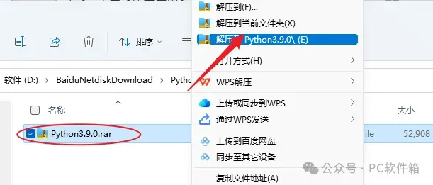 1.解压安装包:鼠标右击【Python 3.9.0】压缩包,选择电脑上安装的解压软件,点击解压到【Python 3.9.0】。