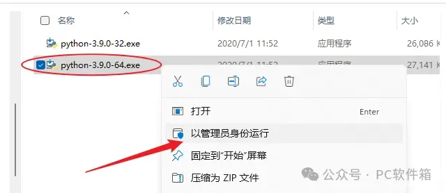 3.进入【Setup】文件夹,右键以管理员身份运行【python-3.9.0-32】安装程序。【python-3.9.0-32】是32位系统安装程序。