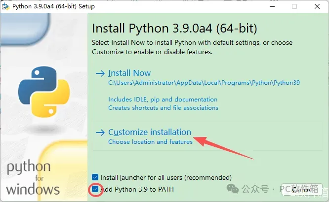 4.勾选【Add Python 3.9 to PATH】,点击【Customize installation】。