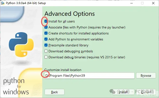 6.勾选【Install Python……】,修改路径地址中的第一个字符C可更改安装位置(建议安装除C盘以外的其他盘,注:安装路径中不能有中文),点击【Install】。