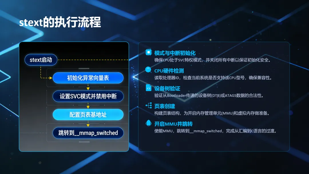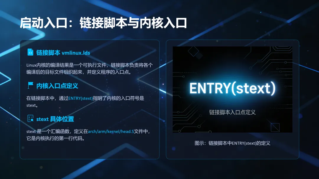 第 493 行的 ENTRY 指明了了 Linux 内核入口,入口为 stext,stext 定义在文件arch/arm/kernel/head.S 中 , 因 此 要 分 析 Linux 内核的启动流程,就得先从文件arch/arm/kernel/head.S 的 stext 处开始分析。