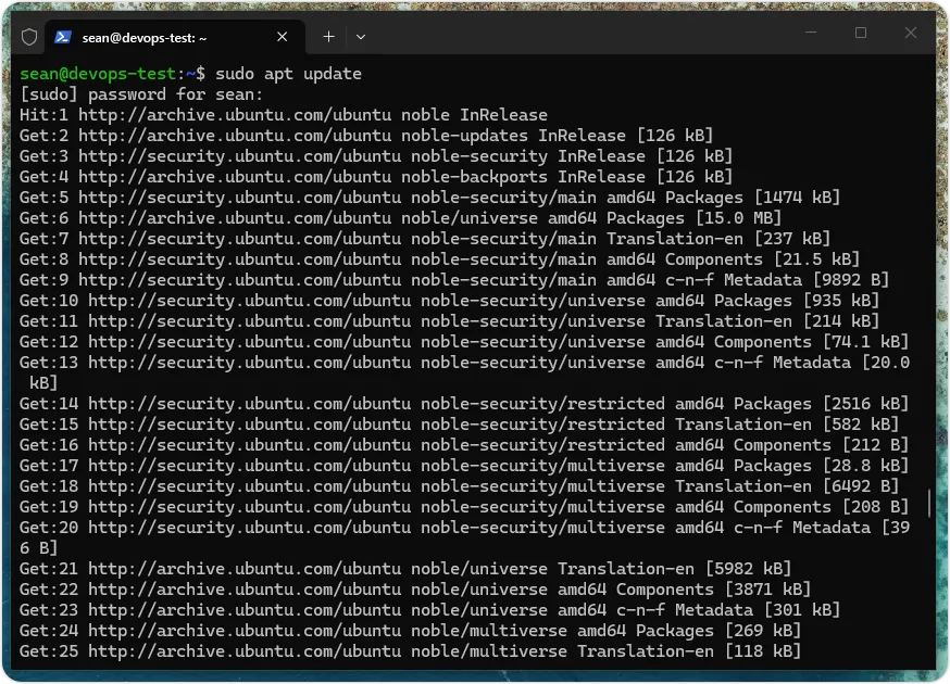我们可以在 Windows 终端机输入命令行命令来安装 Linux 应用程序,例如:安装解压缩 ZIP 文件的 unzip 工具。步骤一:更新软件包数据库