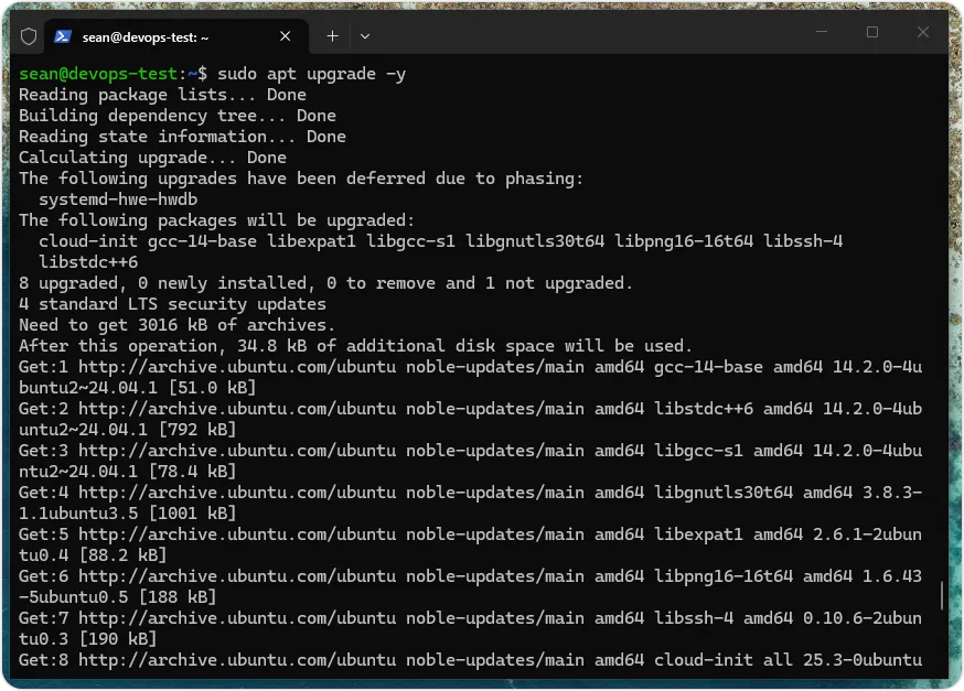 在更新软件包管理数据库后,我们可以使用 apt upgrade 命令升级已经安装的所有应用程序(可能需要输入用户密码),如下所示:上述命令可以升级已经安装的所有应用程序,因为过程可能需要按 Y 键确认继续,所以加上 -y 选项,如此就不需自行按 【 Y 】 键来进行确认,其执行结果可以看到正在升级安装,如下图所示:步骤三:安装应用程序软件包