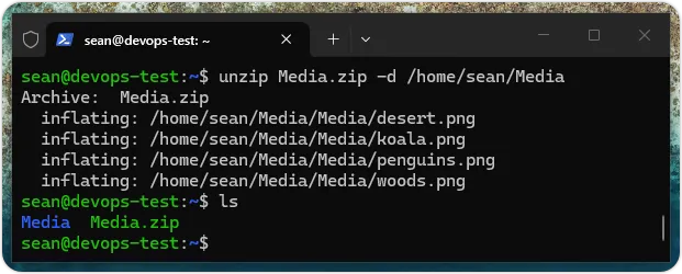 然后执行 ls 命令,可以看到复制的 ZIP 文件,接着使用 unzip 命令解压缩此文件,如下所示:$ unzip Media.zip -d /home/sean/Media