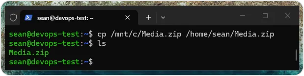 在成功安装 unzip 工具后,我们就可以使用 unzip 命令来解压缩 ZIP 格式的文件,首先,请复制书附范例「C:\Media.zip」文件至 Linux 子系统的用户目录「/home/sean」,如下所示:$ cp /mnt/c/Media.zip /home/sean/Media.zip