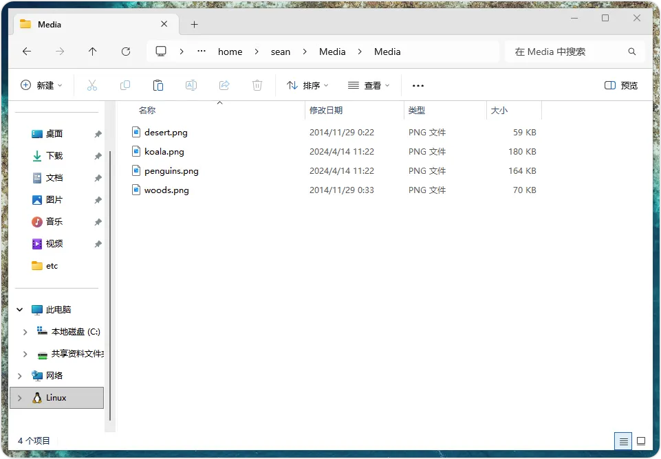 在「/home/sean/Media/Media」目录可以看到解压缩的图文件,我们使用 Windows 文件资源管理器来开启,如下图所示:解除安装应用程序