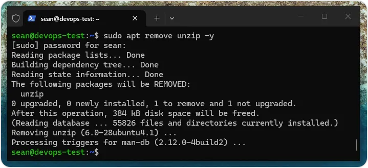 解除安装应用程序就是软件包管理移除软件包,使用的是 apt remove 命令,例如:解除安装上一节安装的 unzip 工具,如下所示:$ sudo apt remove unzip -y