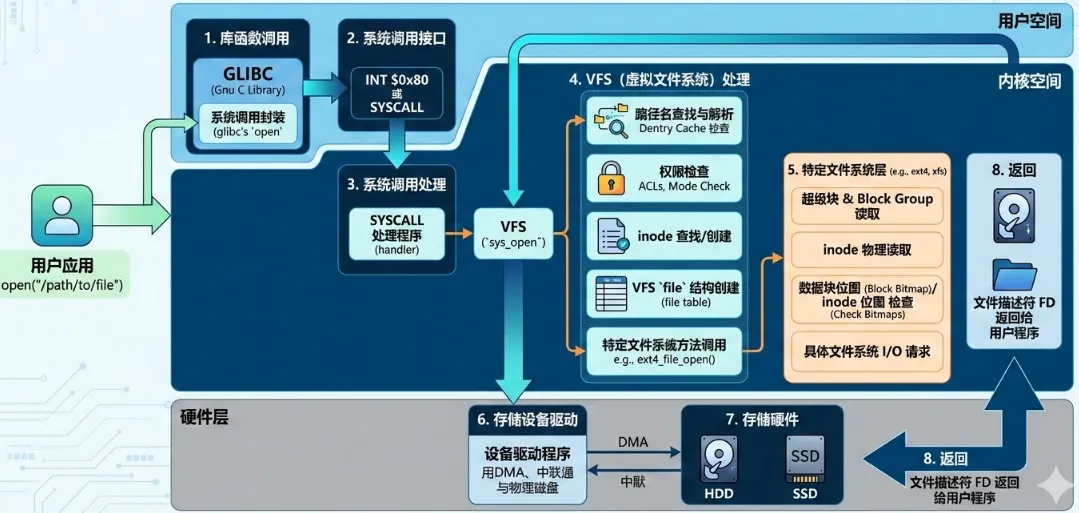 其中最复杂的部分是 路径解析和 dentry 查找。Linux 为了提高性能,引入了多层缓存机制,例如 dentry cache 和 inode cache,这使得大量 open() 调用可以在不访问磁盘的情况下完成。