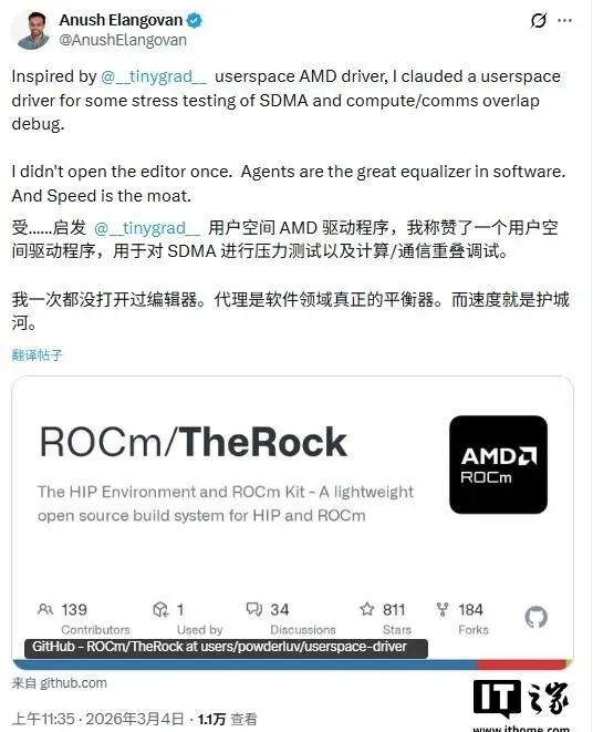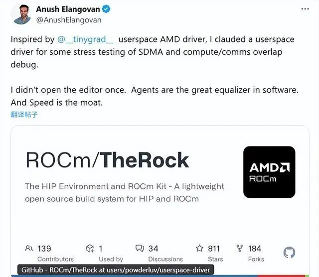 显卡驱动这种底层软件,向来是C/C++的天下,代码量动辄百万行,调试起来能把人逼疯。但就在几天前,AMD一位资深副总裁兼工程师Anush Elangovan,居然用AI(Anthropic Claude Code)写了一个Radeon驱动——而且是用Python。消息一出,很多人第一反应是:AMD要用AI取代传统驱动了?别急,事情远没那么简单,甚至可以说,这个“驱动”压根就不是你理解的那个驱动。