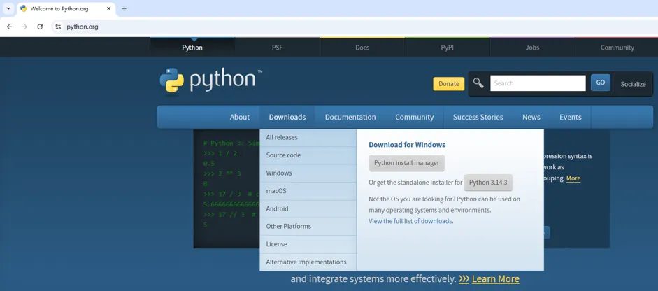 正所谓“工欲善其事,必先利其器”,工匠要想做好他的工作,必须先让他的工具变得锋利好用。同样,我们在编写Python程序之前需要先安装Python开发环境,只有这样,Python代码才能正确地执行。Python开发环境搭建的第一步是安装Python解释器,那么我们为什么要安装Python解释器呢,假设你有一个外国的朋友,他完全不懂中文,那么你给他说中文,他就会一脸懵逼,心想:“不是,这哥们说的啥呀”。这时候他拿出手机打开了翻译软件,这不一下子就能听懂了吗。计算机底层硬件只能直接理解和执行二进制,Python解释器就像是一个翻译软件,他把你写的代码翻译成计算机能够识别的二进制机器码,那么我们先来安装一下Python解释器。(1)打开Python官网https://www.python.org,鼠标指向“Downloads”选项卡在其下拉列表中选择与你的计算机所配套的系统,这里以Windows操作系统为例。