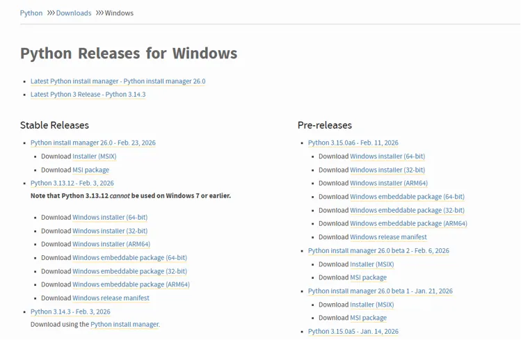 (2)点击“Windows”进入到对应的下载页面,可以选择合适的版本进行下载,其中左边这一列(Stable Releases)是稳定版本,右边(Pre-releases)是预发布版,通常情况下我们选择稳定版本进行下载。