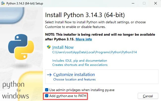 (3)下载完成后,双击运行安装程序安装Python解释器,可以点击Install Now进行默认安装,默认安装会将Python解释器安装到C盘,为了避免C盘空间被占用,我们可以使用自定义安装,在安装的时候我们需要勾选底下的两个复选框,其中第一个复选框是以管理员权限安装Python启动器,“Add python.exe to PATH”用于将Python添加到系统环境变量,添加到环境变量后就可以在CMD命令窗口运行Python文件。