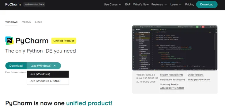 (1)打开PyCharm官网https://www.jetbrains.com/pycharm/,点击“Download”进入到下载页面,Intel和AMD架构选择.exe(Windows)进行下载,高通骁龙架构选择.exe(Windows ARM64)进行下载。