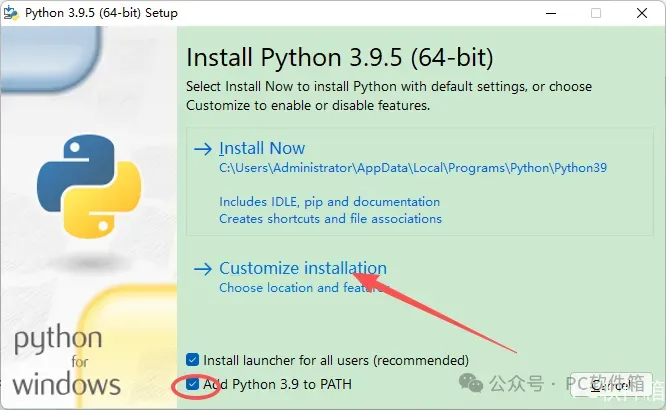 4.勾选【Add Python 3.9 to PATH】,点击【Customize installation】。