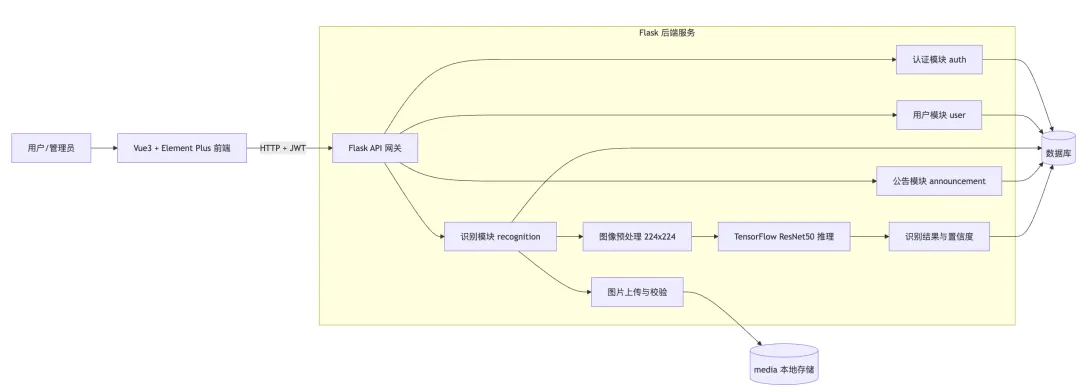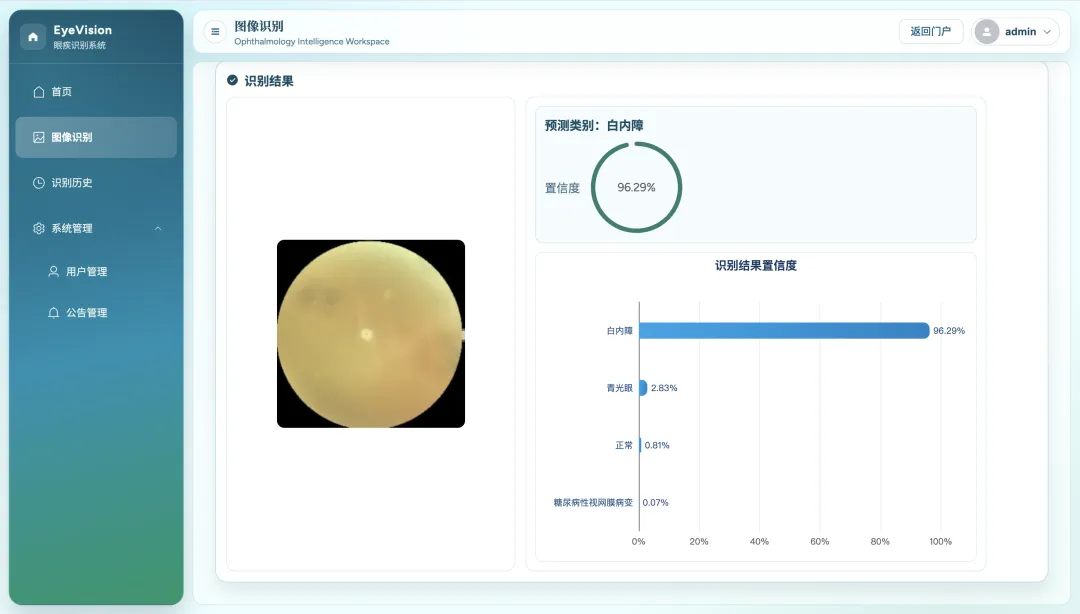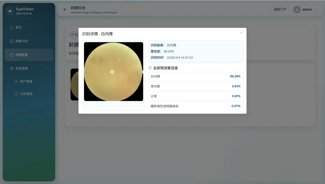 本系统是一个面向眼底图像识别的 Web 应用,采用“前后端分离 + 深度学习推理”架构。前端使用 Vue3 与 Element Plus 构建交互界面,提供用户登录、图片上传、识别结果展示、历史记录查询与公告查看等功能;后端基于 Flask 搭建 RESTful API,结合 JWT 完成身份认证与接口权限控制。系统核心能力是对上传眼底图像进行四分类识别,输出预测类别、最高置信度及各类别概率分布,并将识别记录持久化数据库,便于后续追踪与统计。为满足工程可用性,系统还实现了图片格式与大小校验、静态文件访问、管理员公告管理等模块,形成了从数据输入、模型推理到结果管理的完整闭环,可用于教学演示、小规模筛查场景验证与后续功能扩展。