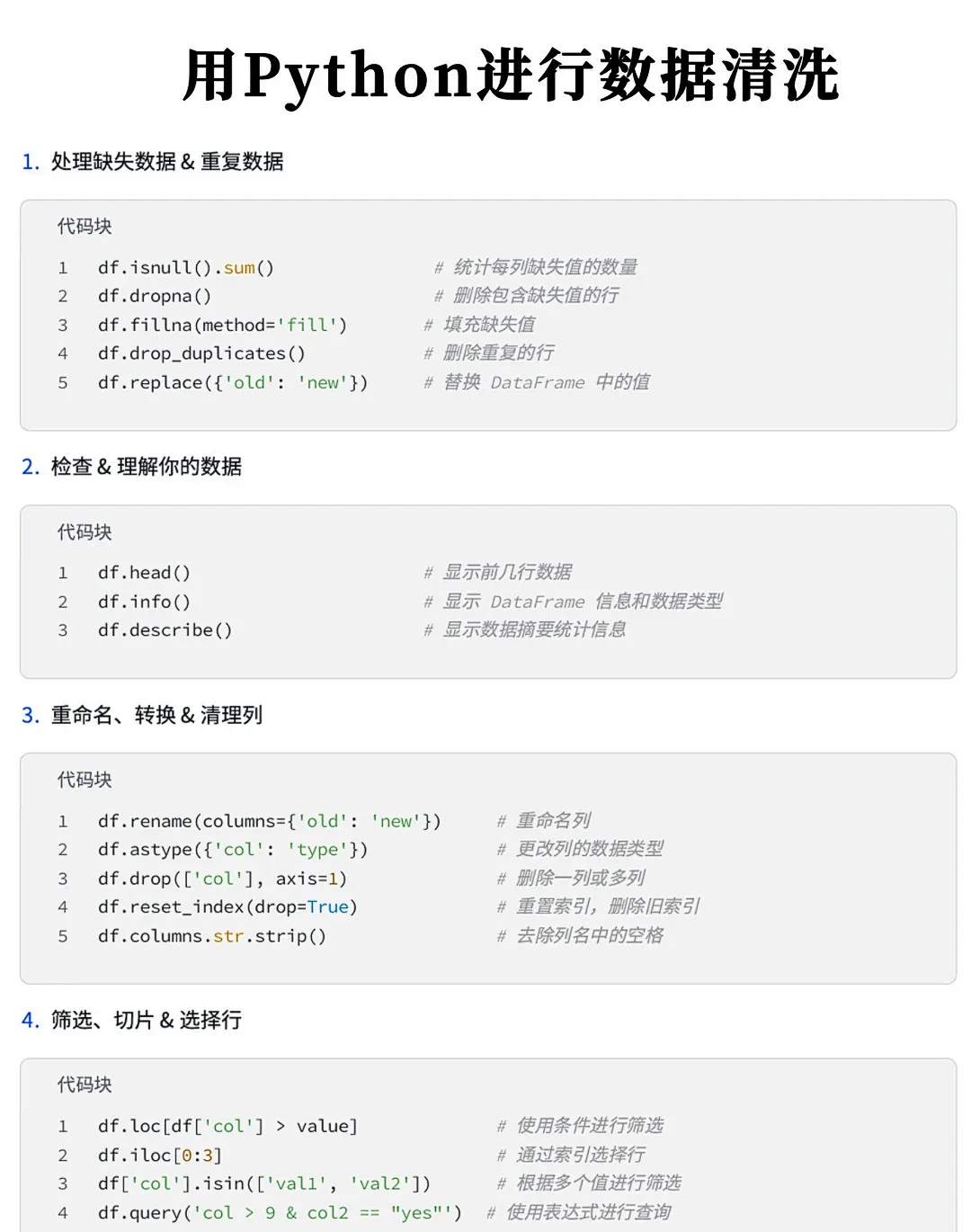 Python 数据清洗操作速查表,用 Pandas 库进行数据预处理的常见方法。