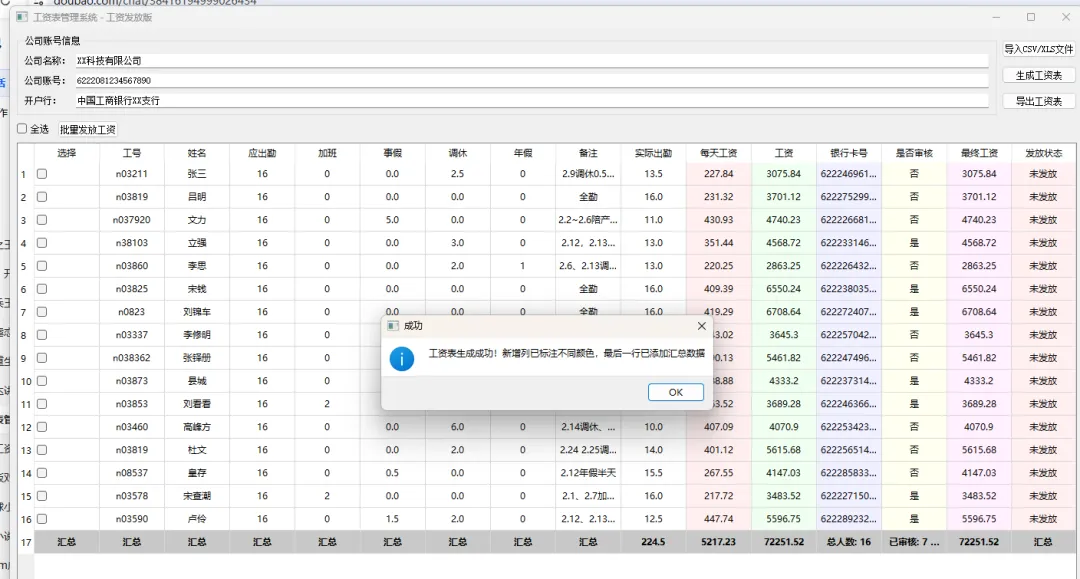 QMessageBox.information(self, "成功", "工资表生成成功!新增列已标注不同颜色,最后一行已添加汇总数据")