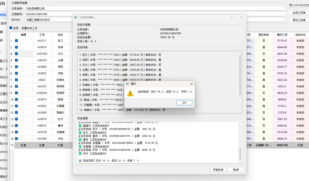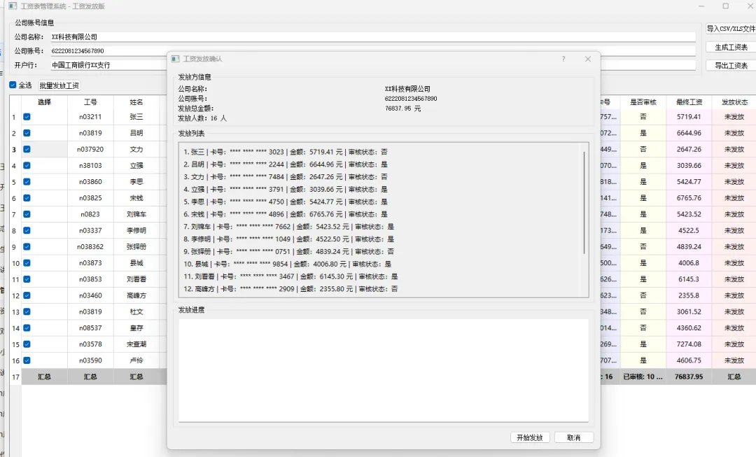 - 逐行显示选中员工的发放信息(姓名、隐藏后的卡号、金额、审核状态)