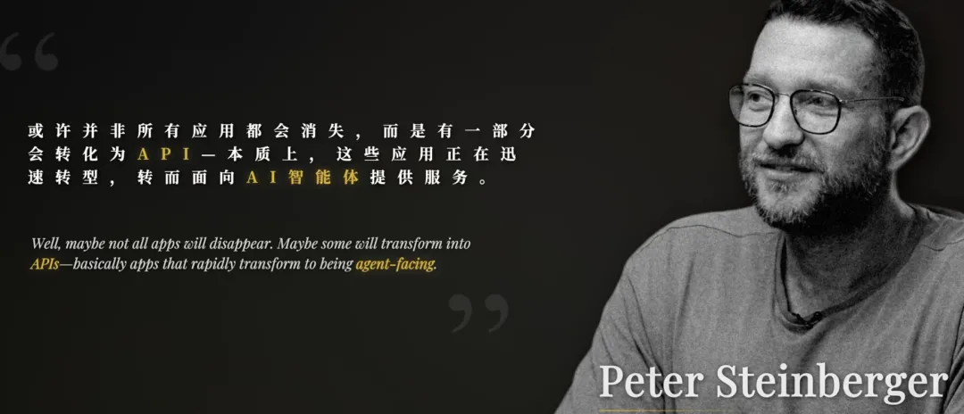 正因如此,OpenClaw 的作者 Peter 大胆预测:未来 80% 的应用软件,要么被 AI 智能体淘汰,要么转型为智能体的接口,人类将彻底告别复杂的软件操作,直接向智能体下达任务即可。