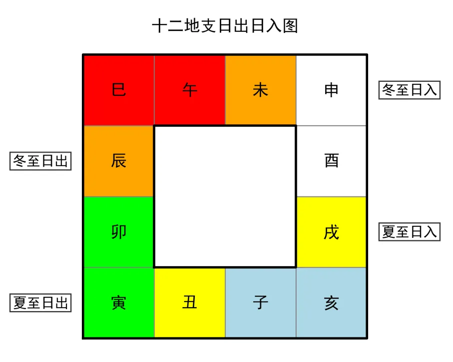 import matplotlib.pyplot as pltfrom matplotlib.patches import Rectangle# 设置中文字体plt.rcParams['font.sans-serif'] = ['SimHei']plt.rcParams['axes.unicode_minus'] = False# 创建图形fig, ax = plt.subplots(figsize=(7, 7))ax.set_aspect('equal')ax.set_xlim(-1.2, 5.2)ax.set_ylim(-1.2, 5.2)ax.axis('off')# 外正方形边界 (0,0) 到 (4,4)outer_x = [0, 4, 4, 0, 0]outer_y = [0, 0, 4, 4, 0]# 内正方形边界 (1,1) 到 (3,3)inner_x = [1, 3, 3, 1, 1]inner_y = [1, 1, 3, 3, 1]# 颜色映射字典(从地支到颜色)color_dict = { "寅卯": "#00FF00", # 纯绿色 "巳午": "#FF0000", # 纯红色 "辰未": "#FFA500", # 橙色 "戌丑": "#FFFF00", # 纯黄色 "申酉": "#FFFFFF", # 纯白色 "亥子": "#ADD8E6" # 浅蓝色}color_map = {}for key, value in color_dict.items(): for ch in key: color_map[ch] = value# 12个小正方形的中心坐标(顺时针从寅开始)positions = [ (0.5, 0.5), # 寅 (0.5, 1.5), # 卯 (0.5, 2.5), # 辰 (0.5, 3.5), # 巳 (1.5, 3.5), # 午 (2.5, 3.5), # 未 (3.5, 3.5), # 申 (3.5, 2.5), # 酉 (3.5, 1.5), # 戌 (3.5, 0.5), # 亥 (2.5, 0.5), # 子 (1.5, 0.5) # 丑]dizhi = ['寅', '卯', '辰', '巳', '午', '未', '申', '酉', '戌', '亥', '子', '丑']# 绘制背景色矩形(置于底层)for (x, y), label in zip(positions, dizhi): color = color_map[label] rect = Rectangle((x-0.5, y-0.5), 1, 1, facecolor=color, edgecolor='none', zorder=1) ax.add_patch(rect)# 绘制网格线(只画在环带区域)for x in [1, 2, 3]: ax.plot([x, x], [0, 1], color='gray', linewidth=0.8, zorder=2) ax.plot([x, x], [3, 4], color='gray', linewidth=0.8, zorder=2)for y in [1, 2, 3]: ax.plot([0, 1], [y, y], color='gray', linewidth=0.8, zorder=2) ax.plot([3, 4], [y, y], color='gray', linewidth=0.8, zorder=2)# 绘制内外正方形边框ax.plot(outer_x, outer_y, 'k-', linewidth=2, zorder=3)ax.plot(inner_x, inner_y, 'k-', linewidth=2, zorder=3)# 添加地支文字for (x, y), label in zip(positions, dizhi): ax.text(x, y, label, fontsize=14, ha='center', va='center', zorder=4)# 添加外侧标记(日出在左,日入在右,留出空隙)ax.text(2, 4.3, '十二地支日出日入图', fontsize=14, ha='center', va='bottom')ax.text(-0.6, 0.5, '夏至日出', fontsize=12, ha='center', va='center', bbox=dict(facecolor='white', alpha=0.8, edgecolor='black', pad=2), zorder=5)ax.text(-0.6, 2.5, '冬至日出', fontsize=12, ha='center', va='center', bbox=dict(facecolor='white', alpha=0.8, edgecolor='black', pad=2), zorder=5)ax.text(4.6, 3.5, '冬至日入', fontsize=12, ha='center', va='center', bbox=dict(facecolor='white', alpha=0.8, edgecolor='black', pad=2), zorder=5)ax.text(4.6, 1.5, '夏至日入', fontsize=12, ha='center', va='center', bbox=dict(facecolor='white', alpha=0.8, edgecolor='black', pad=2), zorder=5)plt.savefig('十二地支日出日入图', dpi=300, bbox_inches='tight')plt.show()plt.close()